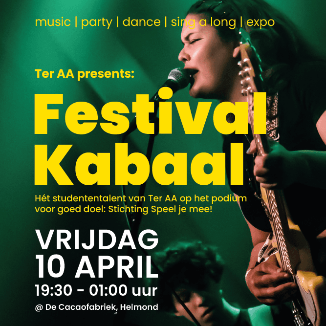 KabAAL is een initiatief voor en door de community van Ter AA. KabAAL wordt georganiseerd door docenten, medewerkers en studenten van Ter AA in samenwerking met externe partners, zoals De Cacaofabriek. Benieuwd wat we nog meer organiseren voor onze community? Kijk dan op teraaconnect.nl.